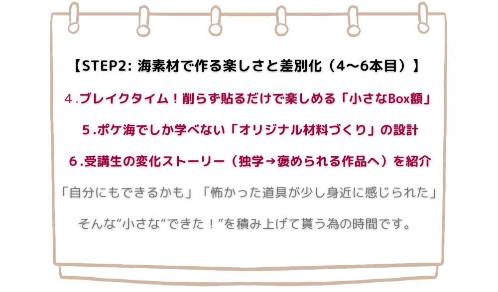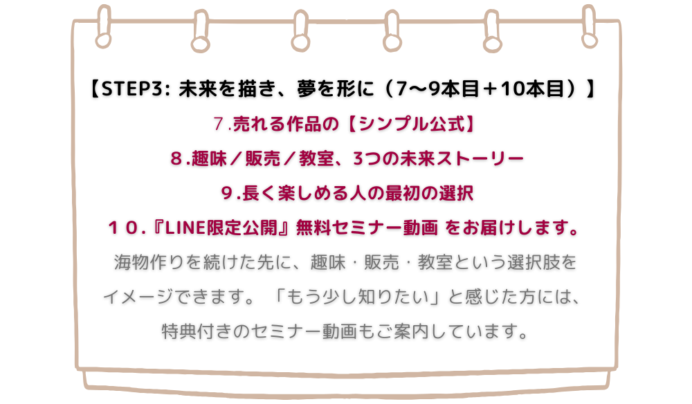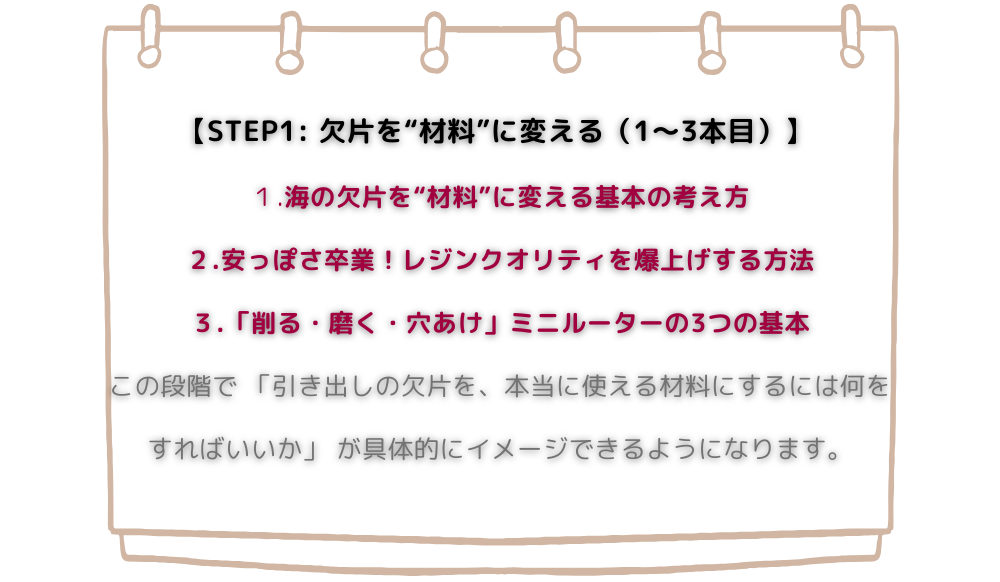 そんな思いから、私自身が積み上げてきた経験や失敗を整理し、「海素材に合う加工手順」として体系化しました。